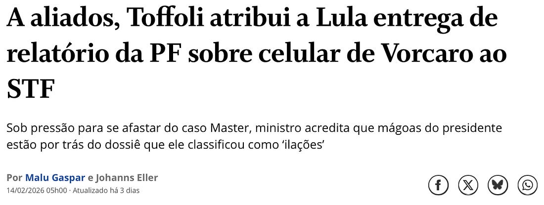 Toffoli deu a dica. Agora a Veja informa o seguinte: “Um graúdo aliado de Lula estaria envolvido na violação dos sigilos”. Ainda não sabemos quem é o “graúdo aliado de Lula envolvido na violação dos sigilos”. Mas Xandão já foi para cima dos 4 funcionários da Serpro envolvidos no vazamento dos sigilos fiscais dos ministros e seus parentes. Segundo a imprensa, “os servidores foram alvo de busca e apreensão. Por ordem de Moraes, foram ainda afastados das funções públicas, tiveram passaportes cancelados e passaram a usar tornozeleira eletrônica”. Mas para se livrar do pepino que se tornou o Banco Master, Lula empurrou a crise pro STF. Acabou a paz entre os guerreiros da democracia. Na confusão carnavalesca do Banco Master, agora é cada um dos si. O NEIM precisa da sua colaboração para continuar revelando o que as notícias escondem. ASSINE AGORA!