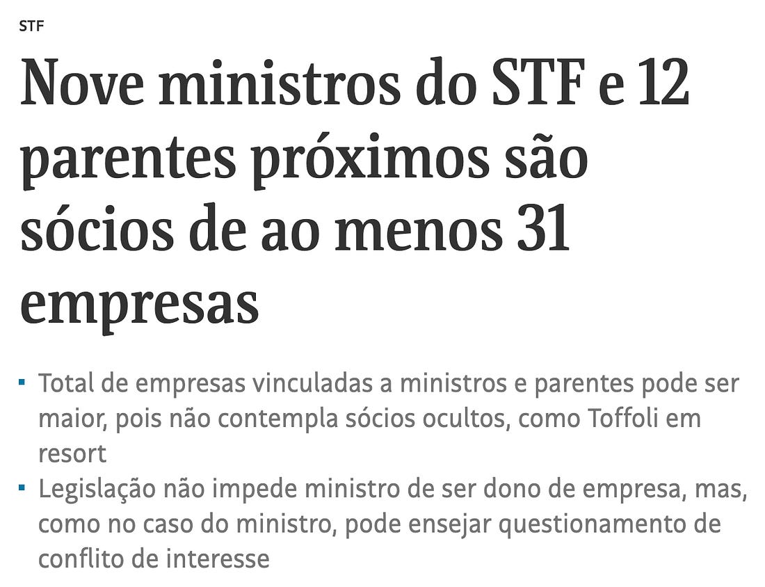 #SupremaNetworkLevantamento da Folha aponta que 9 ministros e 12 parentes diretos são sócios de ao menos 31 empresas