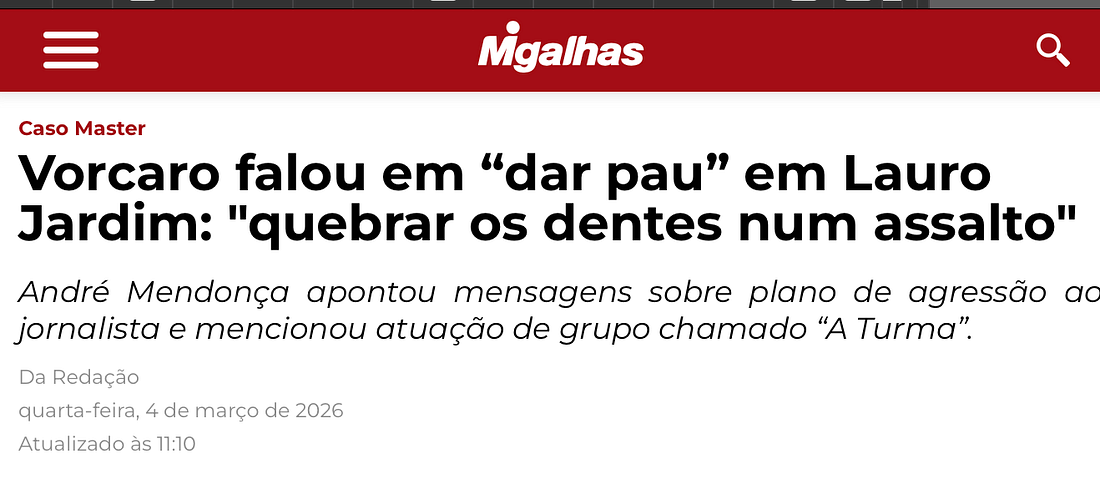 Se por um lado ele tinha a imprensa prostituta que faz tudo por dinheiro, agora veio à tona o grupo de zap mafioso do banqueiro atrapalhão. “A Turma” era o nome do grupo onde aliados do banqueiro discutiam estratégias para monitorar, pressionar e intimidar jornalistas e desafetos. Ali se trocavam informações sobre rotinas, se planejava levantar dados comprometedores e, em alguns casos, sugeriam-se formas de intimidar críticos que publicavam reportagens sobre os negócios do grupo. Além da vida louca de festas privês, Vorcaro gostava de bancar o bandidão com sua '“turma”. Mas era mais uma máfia de brancaleone. Em vez de pistoleiros em bares esfumaçados, havia celulares e mensagenzinhas mal-educadas. Eles queriam “dar um surto”, “dar um pau”, “quebrar dentes”… No final, Vorcaro parece menos um capo de máfia do que um picaretinha nessa corrida maluca que é o Brasil. Mas ele tem boas amizades. Atualmente, você é um assinante gratuito de Não É Imprensa. Para uma experiência completa, atualize a sua assinatura. |