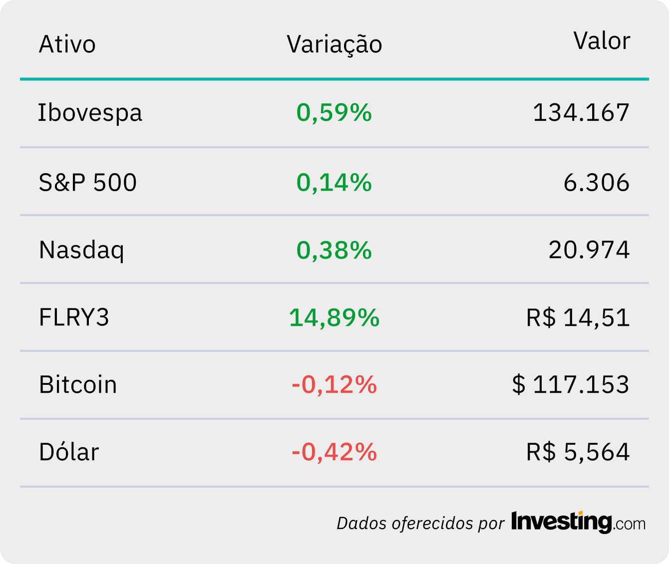 | | Data de referência em relação ao dia de ontem, 21/07. Horário de referência para o Bitcoin: 18h. | O Ibovespa fechou em alta de 0,59%, aos 134.167 pontos, nesta segunda-feira (21). Em Wall Street, o S&P 500 avançou 0,14%, enquanto o Nasdaq subiu 0,38%. | No Brasil, o Boletim Focus trouxe uma leve melhora nas expectativas. Após nove semanas de estabilidade, a projeção de inflação para 2026 caiu de 4,50% para 4,45%.