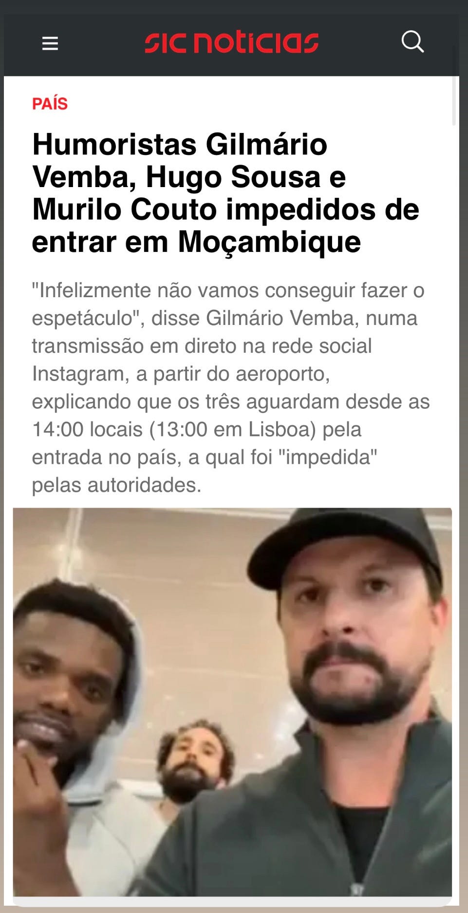 Murilo Couto, um dos caras mais legais da comédia brasileira, está em turnê internacional com outros dois comediantes: Hugo Souza de Portugal e Gilmario Vemba de Moçambique. Após viajarem por diversas cidades e países, chegou a vez do trio fazer show em Moçambique. O problema é que o humorista Gilmario é um crítico do governo de Moçambique e assim que chegaram no Aeroporto Internacional de Maputo foram detidos. Eles chegaram às 14:30 e estão até agora, 00:59 horário local, presos no aeroporto, pois não permitiram a entrada deles no País. E até o momento não foram liberados para irem para outro lugar. Se você acha que censura e autoritarismo oficial contra humorista é exclusividade do Brasil, fica aí o registro de mais essa prova como o mundo está louco. Como claramente o motivo de estarem presos no aeroporto até agora é político, não deixa de ser preocupante. Estamos tentando contato com a Embaixada Brasileira em Maputo, para que tenham ciência. É importante que as pessoas saibam do caso, para que novos abusos contra eles sejam intimidados. Estaremos atentos aqui para que Murilo e os seus amigos sejam liberados logo e voltem em segurança. E se você quiser ser comediante evite trabalhar comigo um dia. Veja o que acontece sempre comigo, com o Léo Lins e com o Murilo Couto. Atualmente, você é um assinante gratuito de Não É Imprensa. Para uma experiência completa, atualize a sua assinatura. |