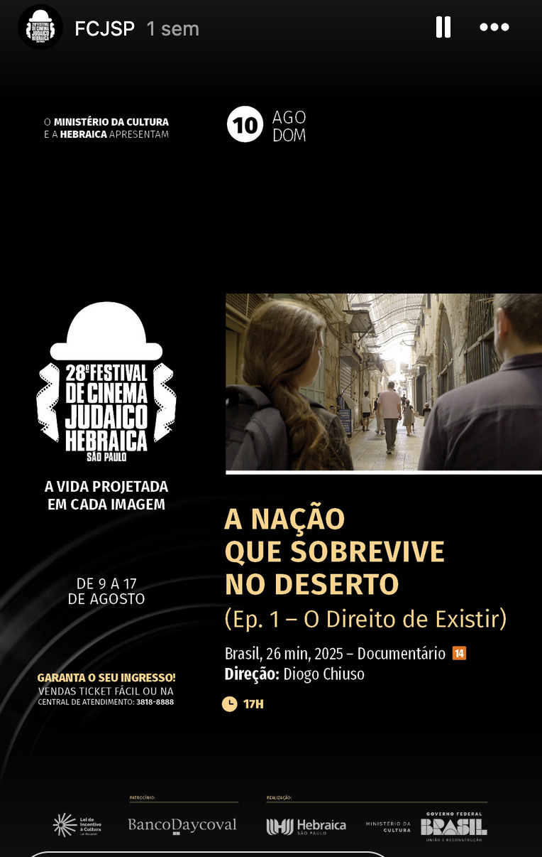 #CinemaNaHebraicaO nosso documentário sobre Israel foi selecionado para o Festival de Cinema Judaico da Hebraica, em São Paulo.O documentário do NEIM, A Nação que sobrevive no deserto, foi selecionado na amostra do 28º Festival de Cinema Judaico da Hebraica. A exibição do primeiro episódio da séria será no próximo domingo, dia 10, junto com o curta Israel mon amour, da cineasta Annabel Targownik, que traz reflexão sobre a identidade israelense a partir da tragédia de 7 de outubro. Após a sessão terá um bate papo com os diretores. A programação do Festival pode ser conferida no site Ticket Fácil (link abaixo). Serão 7 dias, com filmes do Brasil, da Argentina, Polônia, França, Bélgica, Itália, Estados Unidos e Alemanha. Os ingressos estão disponíveis no mesmo site. https://www.ticketfacil.com.br/cah-28-festival-de-cinema-judaico-hebraica-sao-paulo.html 28 Festival de Cinema JudaicoDe 9 a 17 de agosto. Atualmente, você é um assinante gratuito de Não É Imprensa. Para uma experiência completa, atualize a sua assinatura. |