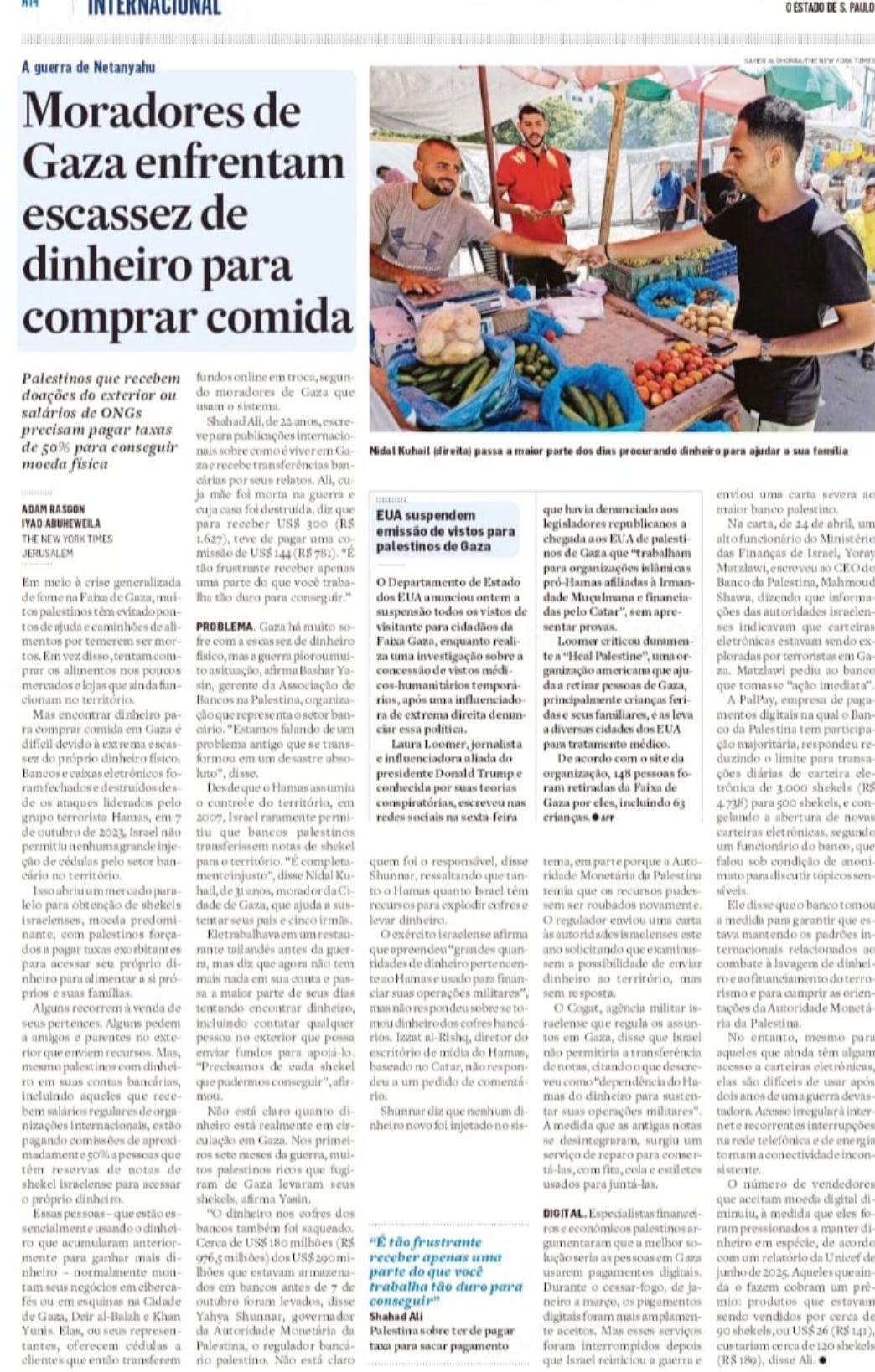 “Repita uma mentira até que ela se torne verdade.” O conselho de Joseph Goebbels, ministro nazista, é usado também pela esquerda (sempre afirmei que esquerda e direita são exatamente iguais). Há mais de um ano, a imprensa de esquerda afirma que os palestinos estão morrendo de fome — e a culpa, claro, é de Netanyahu. Israel sempre desmentiu, afirmando que centenas de milhares de caminhões com ajuda humanitária continuam a entrar em Gaza para distribuir alimentos. Agora publicaram outra matéria para culpar Israel, mas a própria reportagem mostra uma contradição em si mesma. O artigo informa que os moradores de Gaza enfrentam escassez de papel-moeda para comprar alimentos. Culpa de quem? De Israel, é claro. A matéria se autodesmente (existe essa palavra?). A foto mostra vários homens bem alimentados. Mas os palestinos não estavam morrendo de inanição? A foto mostra uma barraca de legumes, como numa feira. Mas não faltavam alimentos em Gaza? A matéria informa que os palestinos têm dificuldades em encontrar papel-moeda para fazer compras. Mas os caminhões de ajuda humanitária fornecem alimentos de graça. Israel afirma que o Hamas rouba os alimentos para vendê-los aos palestinos. A matéria confirma isso. Julio Gartner, um amigo sobrevivente do Holocausto, sempre me dizia: a maior malandragem é falar a verdade. Assim, você não corre o risco de passar vergonha contando mentiras. Atualmente, você é um assinante gratuito de Não É Imprensa. Para uma experiência completa, atualize a sua assinatura. |