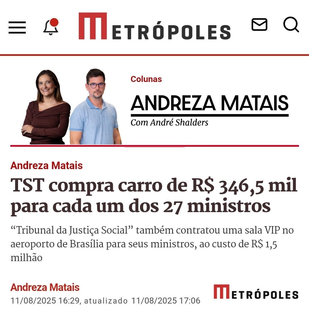 | Depois da história da área VIP no aeroporto, a jornalista Andreza Matais nos trouxe a fábula dos penduricalhos automotivos. Como é que o “Tribunal da Justiça Social” vai trabalhar sem os penduricalhos do amor com valor total de R$ 10.395.000,00? Atualmente, você é um assinante gratuito de Não É Imprensa. Para uma experiência completa, atualize a sua assinatura. | |