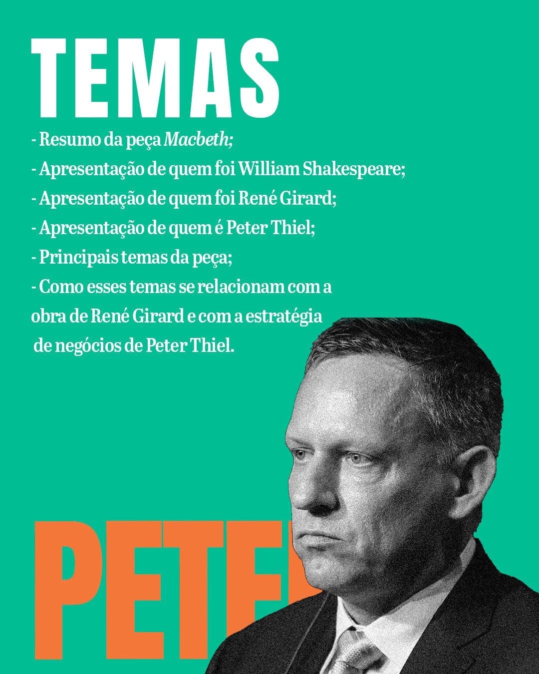 A primeira aula ficou disponível para quem me ajudou no ano passado, via assinatura deste Substack ou via doação no PIX. Mas agora, com o lançamento do curso completo, essa mesma aula vai para um outro lugar na internet, junto com as outras oito partes (é bom repetir: são um total de nove, em média com trinta minutos de duração). Antes de explicar quais são os temas do curso e qual é a condição para adquiri-lo, queria sobretudo agradecer a Henrique Dau, Matheus Hector e Vinicius Franco, membros de Instituto Braudel, que me liberaram integralmente as aulas, além da ajuda inestimável de Junior Staff e Victor Prudêncio, que filmaram e editaram todo o conteúdo, além de terem feito o incrível projeto visual. Assim, abaixo vão os tópicos abordados nas aulas: Dito isso, chegamos ao grande momento: Quanto custará o curso?E a resposta é: Você decide.Isso mesmo: Quem determinará o preço será você, não eu.Veja os temas que serão abordados. Veja a qualidade gráfica do material promocional. Veja o seu interesse. Veja como isso pode te ajudar na sua vida pessoal e pública. Então faça a sua escolha. E aí você envia o valor que acha justo no PIX abaixo:martim.vasques@gmail.comAssim que fizer o pagamento, mande uma mensagem no mesmo endereço acima (vou reforçar: martim.vasques@gmail.com), com o assunto escrito da seguinte forma - CURSO PETER THIEL -, e eu vou lhe enviar um link com acesso, também por e-mail, a uma pasta especial no Google Drive, onde haverá todo o material disponível do curso (é importante reforçar que é bom ter uma conta no Google). Observação importante: Não haverá reembolso no valor a ser pago (e se alguém precisar de Nota Fiscal, posso providenciá-la sem problemas, desde que me informe todos os dados necessários). (Pediria também a paciência de me dar um prazo de 24 horas para responder, pois sou “o exército do eu sozinho” nesta empreitada) Qualquer dúvida, é só conversar comigo por e-mail ou via DM do Substack. Agora a única coisa que posso lhes dizer é: obrigado pela confiança no meu trabalho - e eu espero que consiga cumprir as expectativas. Um forte abraço do MVC |