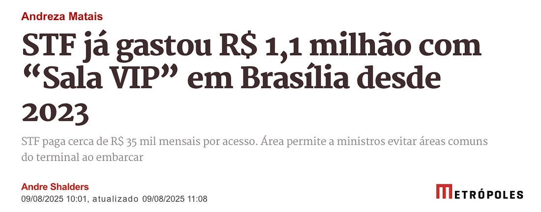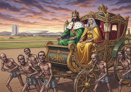 #VivaAMonarquiaSem plebiscito e sem a ajuda da família Orléans e Bragança, a monarquia foi instituída no BrasilEm 11 de dezembro de 2024, eu publiquei no NEIM: "O regime czarista pré-revolução bolchevique teria inveja da Corte de Brasília". Nossa elite de políticos e funcionários públicos de alto escalão tem certeza de que o povo só existe para servi-los, e não o contrário. A prova mais recente foi a autoaprovação, pelo TST, de uma sala VIP no aeroporto de Brasília, para que os ministros fiquem longe do povo "inconveniente, mal-intencionado” e, eu acrescentaria, mal-cheiroso. Como dizia o ex-presidente militar Figueiredo, ele preferia cheiro de cavalo. Além do pequeno Versalhes para mantê-los afastados do povaréu que paga suas contas, eles se beneficiam de Longa vida ao rei e à rainha. Atualmente, você é um assinante gratuito de Não É Imprensa. Para uma experiência completa, atualize a sua assinatura. |