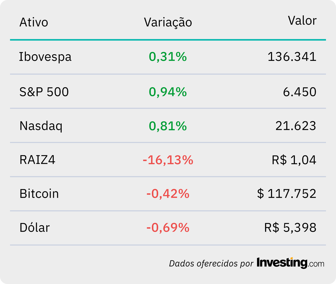| | Data de referência em relação à semana passada, de 11 a 15/08. Para o Bitcoin, o período considerado é de domingo a domingo. | Na última semana, o Ibovespa encerrou em alta de 0,31%, aos 136.341 pontos. Em Wall Street, o S&P 500 subiu 0,94%, enquanto o Nasdaq avançou 0,81%. | Lá fora, os investidores acompanharam os dados de inflação dos EUA. O índice de preços ao consumidor (CPI) de julho veio dentro do esperado, com alta de 0,2%. Já o índice de preços ao produtor (PPI) subiu 0,9% e surpreendeu o mercado, que esperava só 0,2% — o que acendeu um sinal de alerta.