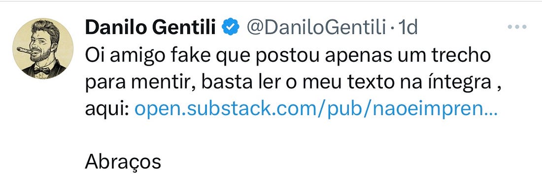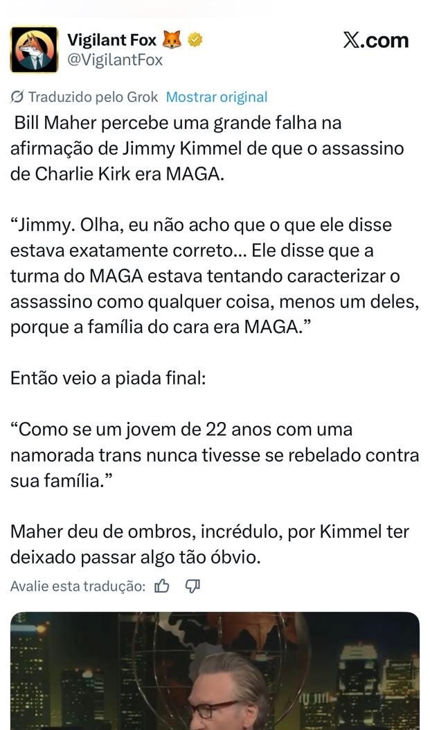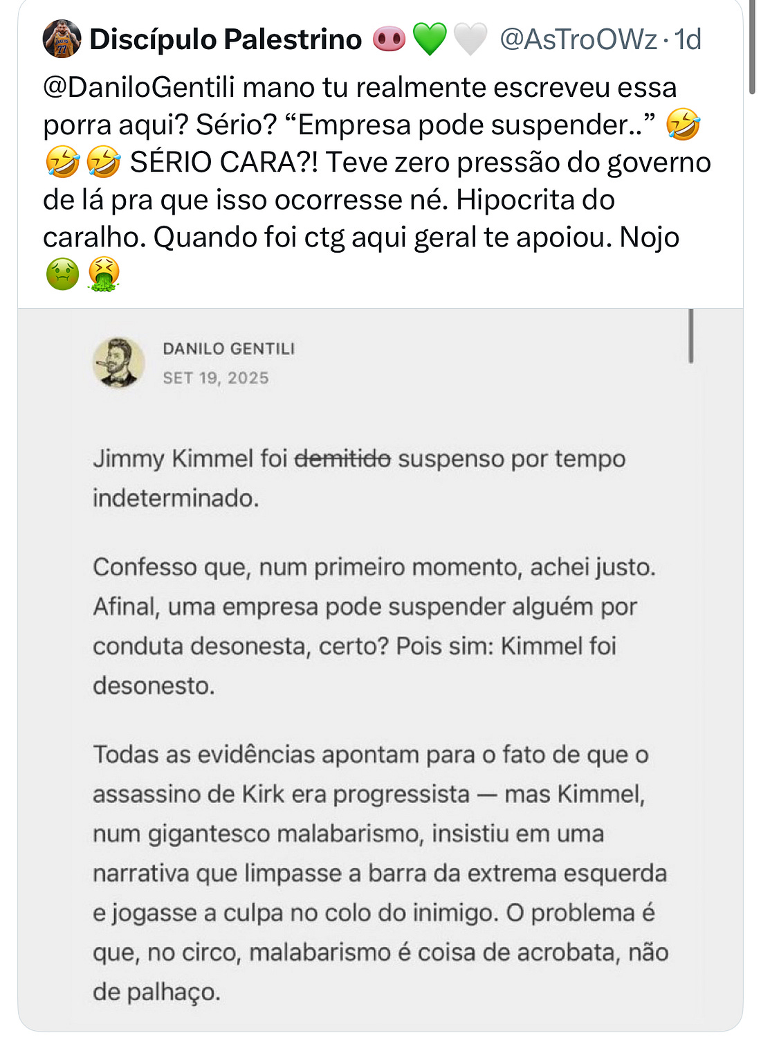 Quando escrevi aqui sobre o recente caso de Jimmy Kimmel, achei que estava dizendo algo óbvio: censura é sempre um erro. Não importa se vem da direita, da esquerda, do centro, de cima ou de baixo. Ter indignidade seletiva a esse respeito, idem. Mas bastou eu afirmar isso para militantes esquerdistas se irritarem — não porque eu tenha dito algo condenável, mas porque esperavam que eu fosse como eles que “passam pano” quando a censura serve a algum lado político. A resposta deles foi previsível: cortaram meu texto, divulgaram apenas uma parte, distorcendo o contexto, como se os três primeiros parágrafos fossem tudo que eu tinha a dizer sobre o assunto. Como esperado saíram disparando isso em massa através de perfis fakes: Essa é a tática preferida da patrulha de autoritários: amputar ideias até que caibam na caricatura que inventaram de você. Depois disso, o apedrejamento está justificado. Aliás, amigos, se não leram ainda podem ler o texto na íntegra aqui. Tirem as suas próprias conclusões: Curioso é que Bill Maher, progressista declarado, democrata de carteirinha e portanto ninguém pode acusá-lo de “bolsonarista” ou “trumpista”, ontem disse exatamente a mesma coisa que eu já havia dito nos primeiros parágrafos do meu texto sobre o caso: Tal conclusão não parece ser política ou partidária. Parece ser óbvia, não? A diferença? Não vi um único comediante citá-lo ou cancelá-lo por isso. Ou seja, como eu sempre falo: O leitor Giancarlo Silveira deixou um ótimo comentário no meu texto anterior: A manada as vezes até aceita uma opinião contrária, mas o que a manada não aceita é você ter opinião própria. O que realmente os consome não é a divergência, mas a inveja de quem ousa pensar com a própria cabeça. No fundo, o que dói em muita gente não é a censura ou a liberdade, mas a constatação de que vivem em rebanho, enquanto outros seguem caminhando de acordo com seus próprios valores e pensamentos. Aos que não passam de pedaços agregados a uma massa disforme, que de maneira fraca e débil se locomove apenas para onde é conduzida, constatar que existem por aí alguns seres completos, que ousaram tirar força da personalidade e caminharem com resistência para onde desejam, corrói por dentro. Pensar com a própria cabeça e não ser o que eles gostariam que você fosse é, para eles, insuportável. É imperdoável. No fundo, meus amigos, tudo se resume a boa e velha inveja. Atualmente, você é um assinante gratuito de Não É Imprensa. Para uma experiência completa, atualize a sua assinatura. |