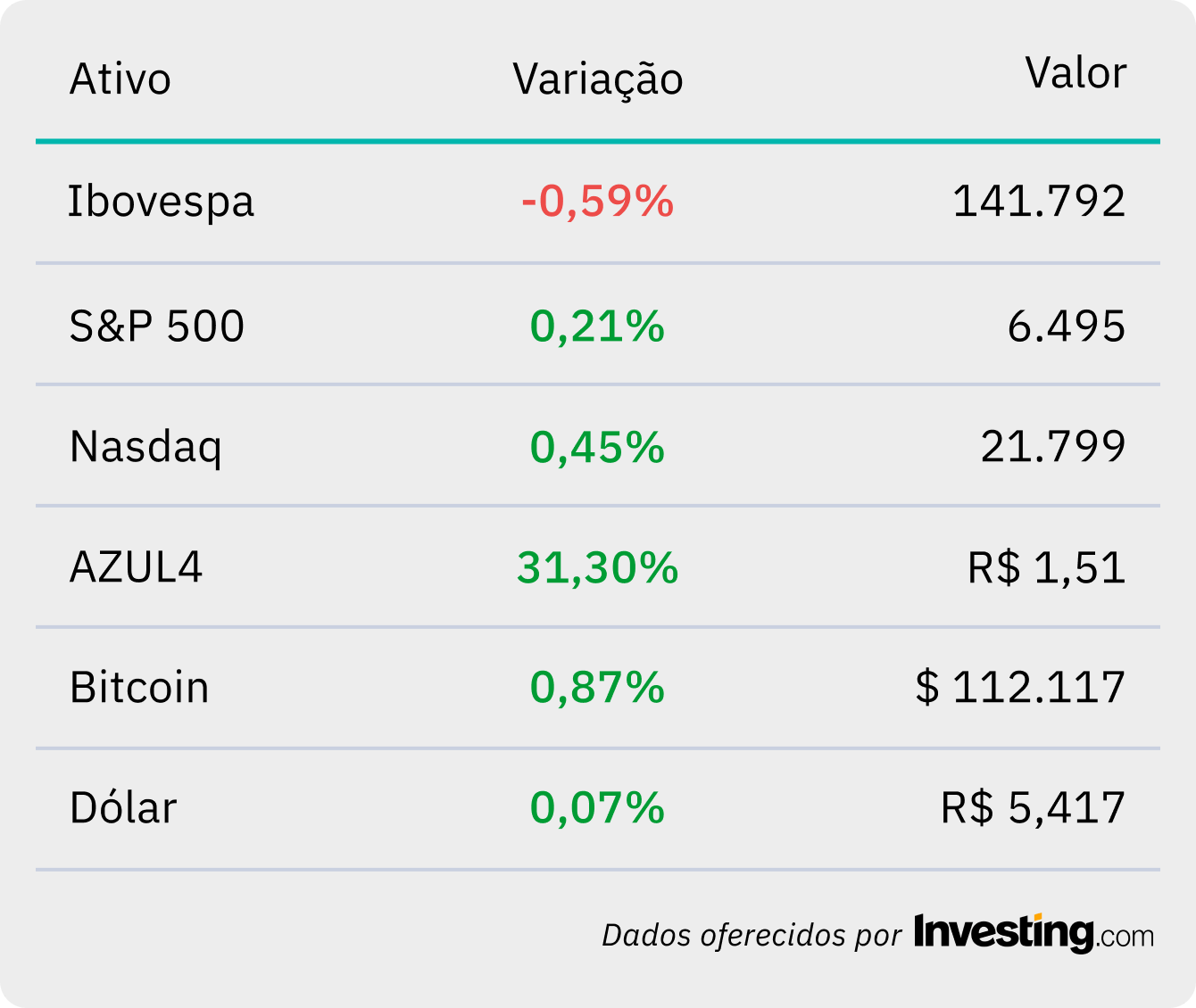 | Nesse contexto, o ouro também subiu e bateu um novo recorde, superando os US$ 3.600 por onça-troy. No acumulado do ano, o metal já sobe 38%. | No mercado acionário brasileiro, destaque para as ações da Azul (AZUL4), que subiram 31,30%. O salto foi atribuído a um short squeeze, quando investidores que apostam na queda são forçados a recomprar ações, impulsionando ainda mais os preços. | No mês de setembro, os papéis da companhia aérea acumulam alta de 122,06%. ✈️ |