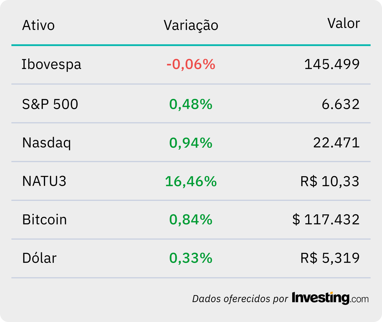 | | Data de referência em relação ao dia de ontem, 18/09. Horário de referência para o Bitcoin: 18h. | O Ibovespa fechou em queda de -0,06%, aos 145.499 pontos, nesta quinta-feira (18). Em Wall Street, o S&P 500 avançou 0,48%, enquanto o Nasdaq subiu 0,94% — ambos renovando suas máximas históricas. | Por lá, o índice Russell 2000, focado em small caps, também bateu recorde e fechou em alta de 2,51% — sua primeira máxima desde novembro de 2021.