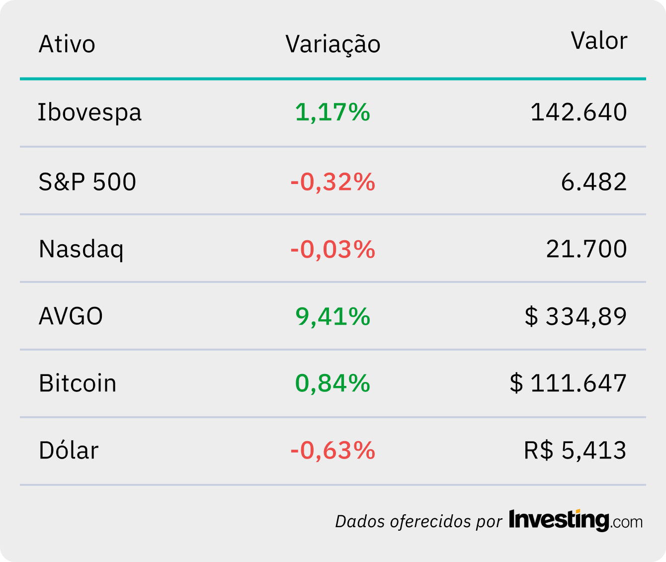 | | Data de referência em relação ao dia de ontem, 05/09. Horário de referência para o Bitcoin: 18h. | O Ibovespa fechou em alta de 1,17%, aos 142.640 pontos, nesta sexta-feira (05) — sua nova máxima histórica de fechamento. Em Wall Street, o S&P 500 caiu -0,32%, enquanto o Nasdaq recuou -0,03%. | Por lá, foi divulgado o Payroll — relatório oficial de empregos dos EUA —, que veio abaixo do esperado. Em agosto, foram criadas 22 mil vagas, frente à projeção de 75 mil. Já a taxa de desemprego subiu para 4,3%, o maior nível desde 2021.