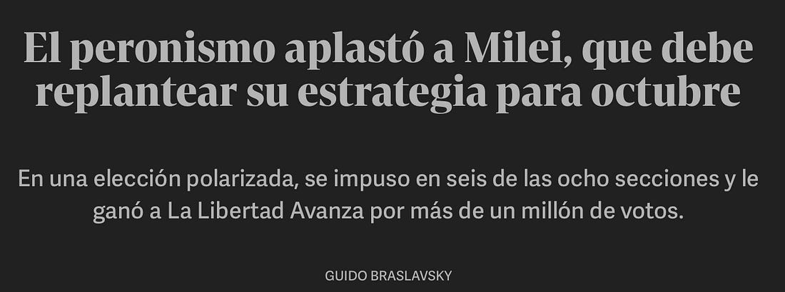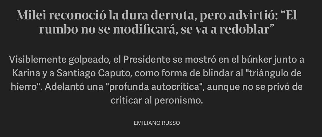 #OsPeronistasRessuscitaramUma semana após o escândalo de corrupção envolvendo a sua irmã, Milei sofre uma amarga derrota na eleição legislativa de Buenos AiresNa semana passada, a irmã de Javier Milei foi envolvida num escândalo de corrupção na compra de medicamentos para deficientes. O NEIM tratou do caso aqui. Ontem os peronistas bateram o partido de Milei com mais de 10% dos votos (47% contra 33%) na província de Buenos Aires, que, além de responder por mais de 30% do PIB argentino, reúne 40% do eleitorado nacional. O problema é que no mês que vem a Argentina vai às urnas para eleger senadores e deputados. Com a derrota do partido de Milei no principal distrito eleitoral, o Governo argentino terá dificuldades na sua gestão – que pode piorar muito se for derrotado novamente em outubro. Pelo menos ele reconheceu a derrota ao invés de recorrer à live de um certo argentino. Mas se pronunciou ao lado da irmã acusada de surrupiar o dinheiro dos remédios dos deficientes. Milei garantiu que não mudará o rumo. Pouco importa o rumo. O que ele precisa é de mais aliados no Congresso para evitar que a oposição continue empacando a sua política de austeridade. A derrota de ontem animou até a moribunda política Cristina Kirchner, que está em prisão domiciliar depois de anos de roubalheira. Ela apareceu na sacada de seu sofisticado apartamento na Recoleta, bairro nobre de Buenos Aires, para comemorar o resultado da eleição – além de ter escrito alguma bobagem nas redes sociais. Não é só o Brasil que dá mole para seus políticos corruptos, que ao serem condenados cumprem prisão domiciliar em apartamentos sofisticados e luxuosas mansões. Mas o que importa mesmo é como Milei vai reverter a situação e não deixar que a história argentina se repita, com mais peronismo e roubalheira para afundar de vez a economia argentina. LEIA TAMBÉM Atualmente, você é um assinante gratuito de Não É Imprensa. Para uma experiência completa, atualize a sua assinatura. |