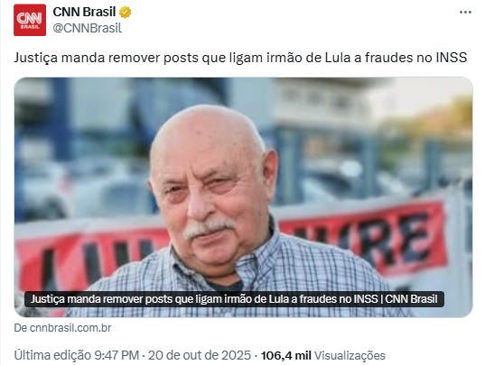 “O irmão de Lula é diretor vice-presidente do Sindnapi (Sindicato Nacional dos Aposentados, Pensionistas e Idosos), entidade envolvida no escândalo do INSS, investigada pela PF (Polícia Federal).” Foi a CNN que disse isso. Não fui eu. Aqui neste site, jamais diríamos coisa semelhante. Diríamos: “entidade envolvida no roubo dos aposentados”. É necessário sermos mais corretos no uso das palavras, não é? Para não correr o risco de disseminar fake news. Mas o fato é que é difícil saber ao certo o que a justiça brasileira batiza, canoniza, excomunga ou juriprudencia como fake news. É um mercado muito volátil. E não dá para confiar nos manuais. Aqueles velhos livros com títulos engraçados: Constituição, Código Penal, Lei disso e daquilo… Todos defasados. Vivemos uma nova era: a da hermenêutica em tempo real. Para saber o que vale ou não vale, é preciso ouvir longos e intermináveis votos no STF. Ler e interpretar decisões de juízes. Decifrar recados que assessores de imprensa dos juízes transmitem nos jornais. Então, para evitar problemas, o melhor é ignorar fatos que, até outro dia, eram públicos e notórios. Por exemplo, não vamos mencionar que Frei Chico, irmão de Lula, é vice-presidente do Sindnapi, o Sindicato Nacional dos Aposentados, que por acaso aparece nas manchetes por conta da Operação Sem Desconto da Polícia Federal. Também não vamos mencionar nunca que Frei Chico não poderia ser vice-presidente da entidade, sendo irmão do presidente da república. Vamos evitar tanto quanto possível tentar compreender porque ele não pode comparecer na CPMI, depois dos onze pedidos feitos por parlamentares. Só trataremos desses assuntos quando houver a devida autorização judicial. Protocolada, carimbada e transitada em julgado. Enquanto isso, seguimos em prudente silêncio, aguardando que o Estado, em sua infinita sabedoria, nos diga quando será seguro ter uma opinião. Agora, vamos todos fazer 2 minutos de silêncio. Um pela justiça. Outro pela liberdade de expressão. Atualmente, você é um assinante gratuito de Não É Imprensa. Para uma experiência completa, atualize a sua assinatura. |