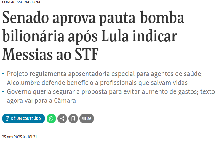 Dizem que foi retaliação à escolha de Messias, mas a aprovação da pauta-bomba bilionária teve apoio do governo e da oposição