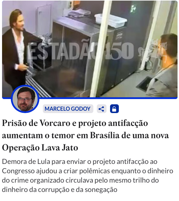 | A prisão do banqueiro fake, Daniel Vorcaro, dono do finado Banco Master, um pouco antes de fugir do país em seu jatinho, reacendeu em Brasília o medo de uma nova Lava Jato. É o que diz o colunista do Estadão. No meio da matéria a gente descobre quem anda com trauma de Lava Jato... Assine Não É Imprensa para desbloquear o restante.Torne-se um assinante pagante de Não É Imprensa para ter acesso a esta publicação e outros conteúdos exclusivos para assinantes. Uma assinatura oferece a você: | Publicações apenas para assinantes e arquivo completo |  | Comente nas publicações, participe do chat e junte-se à comunidade |