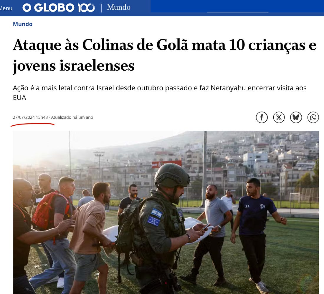 #IsraelComPit(3)Estivemos na cidade drusa atacada pelo Hezbollah em 2024, matando 12 crianças e deixando uma dezena de feridosEm julho de 2024, o Hezbollah disparou um míssel numa cidade israelense de Majdal Shamsna, na fronteira com o Líbano, onde vive uma comunidade drusa (minoria étnico-religiosa árabe-muçulmana). A explosão ocorreu num campo de futebol de uma escola e matou 12 crianças – nove meninos e três meninas – e também deixou diversos feridos. O local da explosão está sendo reconstruído. Veja o vídeo. Abaixo a manchete do jornal O Globo sobre o caso. Lembrando que foram 12 crianças. E uma dezena de feridos. Atualmente, você é um assinante gratuito de Não É Imprensa. Para uma experiência completa, atualize a sua assinatura. |