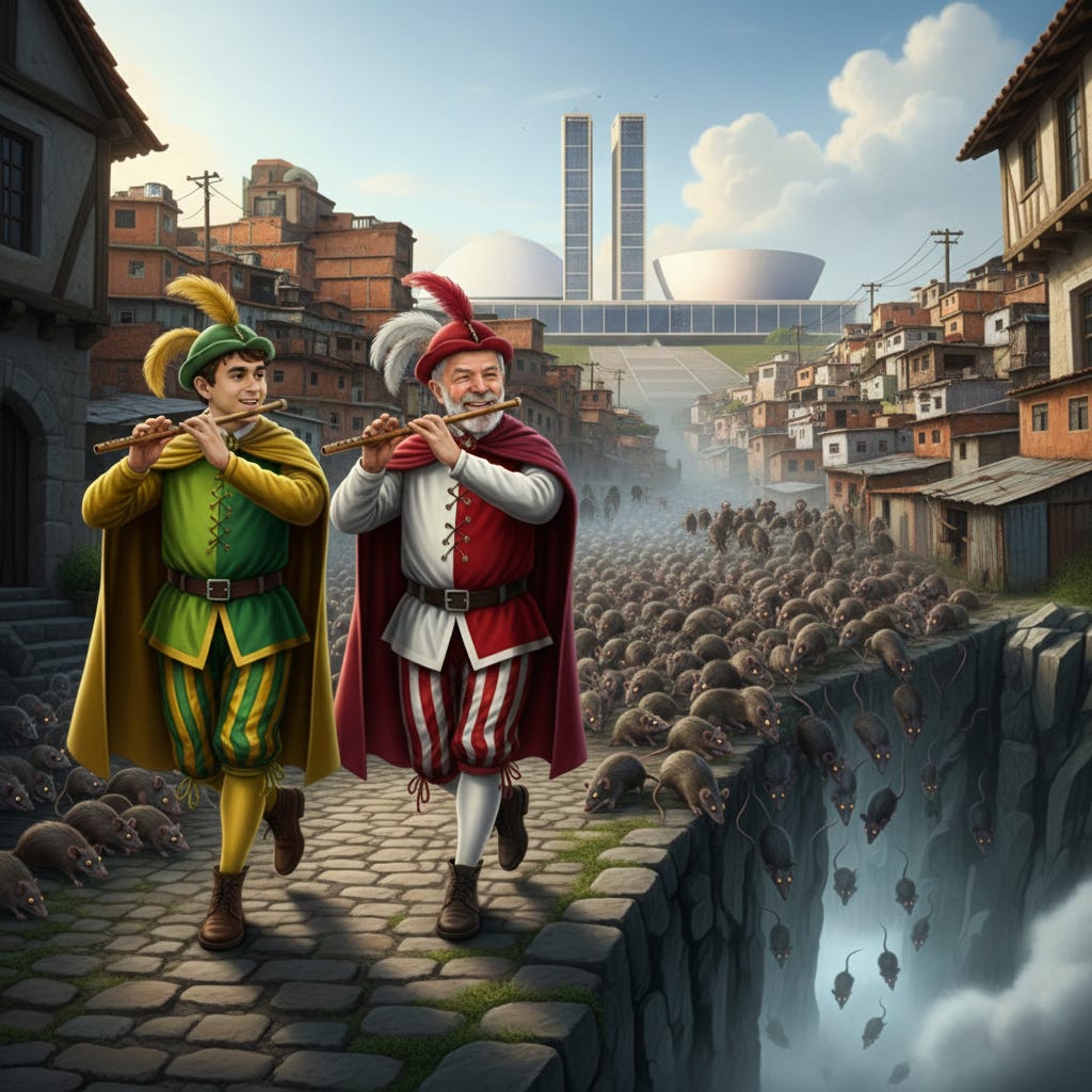 Desde Getúlio, o brasileiro desaprendeu a ser cidadão para virar fã de estelionatário. Não sabemos cobrar, propor ou solucionar; só sabemos ajoelhar e lamber as botas de qualquer bezerro de ouro que brilhe no lixo. No Brasil, não se elege uma plataforma, um projeto ou uma ideia. Aqui se elege um hospedeiro para o delírio coletivo. O cardápio de psicopatologias é vasto: tivemos o getulismo, o malufismo, o lulismo, o bolsonarismo e, agora, o narcisista de Jesus tenta parir o Nicholismo. Ninguém vota na esquerda por causa de agenda econômica ou justiça social. Votam porque o Lula é o Pai, o avatar, a divindade de nove dedos. Se o pinguço larápio não aparecer ungindo qualquer poste ou ladrão de galinha, o candidato não ganha nem para síndico. Por isso o partido o mantêm conservado num tonel de cachaça; se bobear, quando o fígado finalmente pedir arrego, assim como Moisés ergueu uma serpente de bronze no deserto, vão empalhá-lo e carregá-lo em procissão nos comícios, como um boneco de Olinda. Por sua vez a direita brasileira não quer uma liderança ou um plano de ação. Ela quer um messias, um novo dono de curral. E é nesse vácuo de inteligência que o inútil do Flávio Bolsonaro tenta se escorar. O “Príncipe das Rachadinhas”, cuja único trabalho que já teve na vida foi pedir para o papai entregar o Brasil de bandeja para o sistema em troca de não ser investigado, acha que a biologia substitui o caráter. Acha que basta o carimbo do “Mito” para garantir a perpetuação da sua mediocridade no poder. E o pior? Ele está certo. Neste hospício, você pode ser o saqueador da Petrobras ou o coletor de rachadinhas: se for endossado pelo psicopata que atingiu o status de divindade, o gado vota. Sem questionar nada. O jogo não é sobre melhorar o país; é sobre quem consegue ser adorado o suficiente por uma massa de manobra para garantir a mamata eterna às nossas custas. A família Bolsonaro, que conhece bem o jogo, já percebeu o avanço do aspirante a coronel Nicholas. Quem, assim como eu, observa atento o movimento das milícias digitais, já percebeu que volta e meia Carluxo manda os seus cachorros atacarem Nicholas na internet. Esse é o desespero de quem não quer dividir o dízimo da atenção. Mas, como a marcha do pequeno falso profeta atraiu gado suficiente, a família Bolsonaro que se acha os donos do curral, tiveram que engolir o orgulho e aparecer na foto para roubar um pouco do holofote. Mas não se enganem: na máfia do culto à personalidade, não há espaço o suficiente no altar para dois bezerros de ouro. Logo veremos o covarde Carluxo atacando Nicholas na Internet de novo. No meio disso tudo temos nós, pessoas comuns que pagam por esse showzinho de quinta. Quando você perguntava sobre a palhaçada armada por Nicholas essa semana: “Qual o propósito dessa caminhada? Qual a pauta? O que isso muda a nossa vida?”, a resposta do gado adestrado é o clássico: “Pelo menos ele está fazendo algo, e você?”. Eu te digo o que eu estava fazendo enquanto o pequeno narcisista de Jesus marchava: eu estava trabalhando. Estava suando frio para manter negócios e empregos, tentando entender como sustentar as famílias que dependem de mim enquanto sou assaltado por uma montanha de impostos novos e velhos. Imposto esse que financia o fim de semana de marketing egoico dessa corja que nunca pegou em uma enxada e agora usa o nome de Deus para garantir o próximo mandato. Enquanto o falso profetinha marchava, o Lula, aquele que eles fingem combater, enfiava a faca no nosso bolso e dificultava qualquer vislumbre de progresso que podíamos imaginar. Enquanto o falso profetinha marchava, Toffoli (ignorado por Nicholas e família Bolsonaro) abafava o caso Tayaya e ria da nossa cara. E a “maior oposição da história”? Estava ocupada demais tirando selfie e fazendo vídeo com música gospel sentimental pro Instagram. Você sustenta o luxo do Lula, os mimos do Toffoli, os delírios do Nicholas e as mansões da família Bolsonaro. Você faz tudo por eles. E eles? O que fizeram por você até hoje? Um dia o povo entregou todo o ouro que tinha para fundir um bezerro e adorá-lo em vão. É diferente aqui? Ontem na tal marcha, quando o raio caiu do céu e feriu devotos de São Nicholas, a hipocrisia brilhou mais que o trovão. Para quem vê “sinal de Deus” em picareta mancando e até em mancha de mofo na parede, o raio foi “simples acaso”. Se fosse um arco-íris, teria sido a mão divina ungindo o líder. Como foi uma descarga elétrica na cabeça dos fiéis, Nicholas chamou de simples fatalidade. Se alguém usar a mesma narrativa dos ungidos da mamata e insistir que nada cai do céu sem a permissão de Deus, o profeta dirá que faltou fé às vítimas ou que eram lulistas infiltrados sendo castigados. Juntar uma multidão histérica embaixo de tempestade em campo aberto nunca será responsabilidade sua se você estiver acima do bem e do mal. É fácil ser político no Brasil. No lulismo, tudo é culpa do fascismo. No bolsonarismo/nicolismo, tudo é culpa do diabo. E os deuses são eles próprios. Assim como o Flautista de Hamelin atraía ratos e crianças para o abismo, esses Flautistas de Merdelin só atraem dois tipos: os psicopatas que querem se perpetuar no poder pra mamar às nossas custas e a população histérica que se deixa usar como massa de manobra. Ou seja, ratos e crianças. Em um lugar onde a maioria é composta por ratos e crianças é com uma caminhada rumo ao abismo que a história termina. Atualmente, você é um assinante gratuito de Não É Imprensa. Para uma experiência completa, atualize a sua assinatura. |