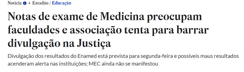 #MenosMédicosO governo Dilma inundou o país de cursos ruins para agora o Lula3 posar de herói da fiscalização com o EnamedA Associação Nacional das Universidades Particulares (Anup) correu aos tribunais para “proteger” os estudantes de medicina. Tentaram, sem sucesso, impedir a divulgação das notas do Enamed, o novo exame que avalia quem pode ou não ser médico no país. O argumento oficial é de que a divulgação causaria “danos irreparáveis” aos alunos. O provável argumento real, que não consta na petição mas brilha nas entrelinhas, é o pânico das grandes empresas educacionais de verem suas ações na Bolsa de Valores derreterem quando o mercado descobrir que a mensalidade de 10 mil reais não entrega nem o básico. Assine Não É Imprensa para desbloquear o restante.Torne-se um assinante pagante de Não É Imprensa para ter acesso a esta publicação e outros conteúdos exclusivos para assinantes. Uma assinatura oferece a você: