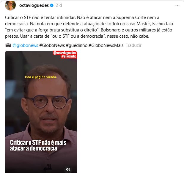 #RelativizamosOsExagerosDo Desbunde Suprêmico à Supremacia Contida. A imprensa quer substituir o passado, ou melhor, o pano passadoA Terra girou, o eixo se inclinou e, de repente, a física quântica do jornalismo brasileiro mudou suas leis fundamentais. Vocês sentiram? Foi sutil, quase imperceptível, como uma brisa suave que precede um furacão de hipocrisia. Uma epifania mística que acometeu nossos brilhantes analistas de telejornal. O grande oráculo da TV, Octavio Guedes, aquele titã da sinceridade seletiva, soltou a pérola que deveria ser escrita com batom na estátua da justiça: “Nós relativizamos os exageros do Supremo para salvar a democracia, mas agora não dá mais”. Jura? Parem as máquinas. Abram as porteiras. Agora, estamos autorizados a falar sobre as ilegalidades, ou melhor, sobre os exageros dos suprêmicos... Assine Não É Imprensa para desbloquear o restante.Torne-se um assinante pagante de Não É Imprensa para ter acesso a esta publicação e outros conteúdos exclusivos para assinantes. Uma assinatura oferece a você: