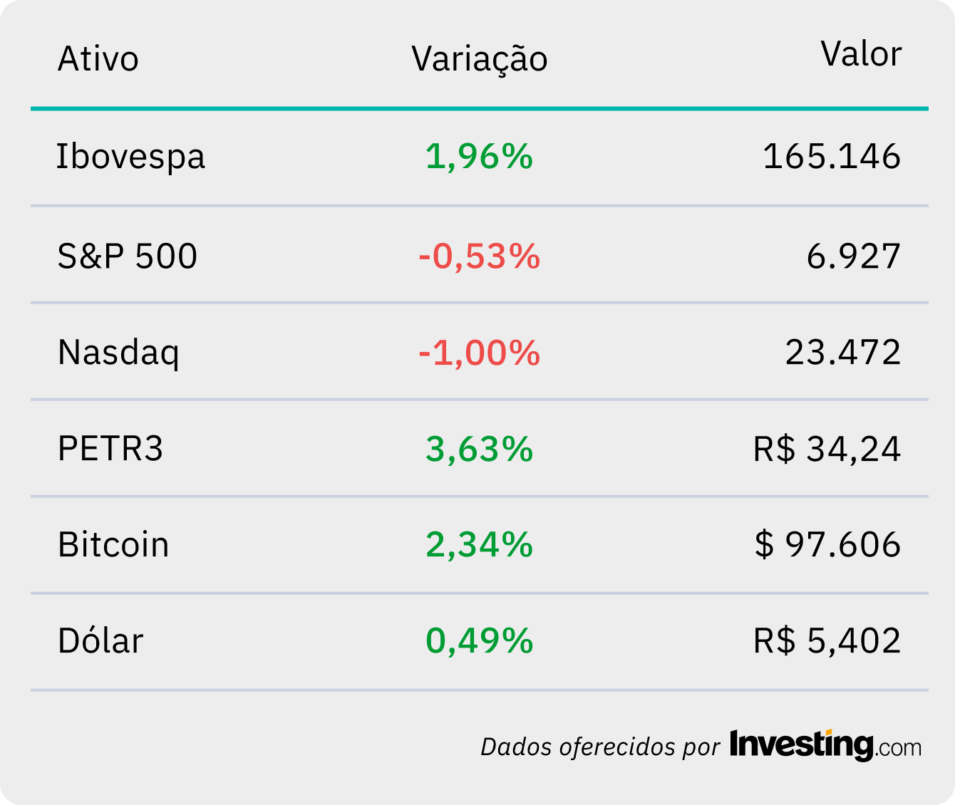 | | Invista com confiança com a plataforma InvestingPro. 📈 Data de referência em relação ao dia de ontem, 14/01. Horário de referência para o Bitcoin: 18h. | O Ibovespa fechou em alta de 1,96%, aos 165.146 pontos, nesta quarta-feira (14), renovando sua máxima histórica. Em Wall Street, o S&P 500 caiu -0,53%, enquanto o Nasdaq recuou -1,00%. | | Com isso, no Brasil, as petroleiras avançaram em "bloco": Petrobras (PETR3) subiu 3,63%, Prio (PRIO3) ganhou 2,97% e Brava (BRAV3) avançou 1,99%. | Extra: O Agibank entrou com pedido de abertura de capital na Bolsa de Nova York (NYSE), buscando captar cerca de US$ 1 bilhão. O movimento coloca a fintech como mais uma empresa brasileira a tentar acessar o mercado de capitais dos Estados Unidos. |