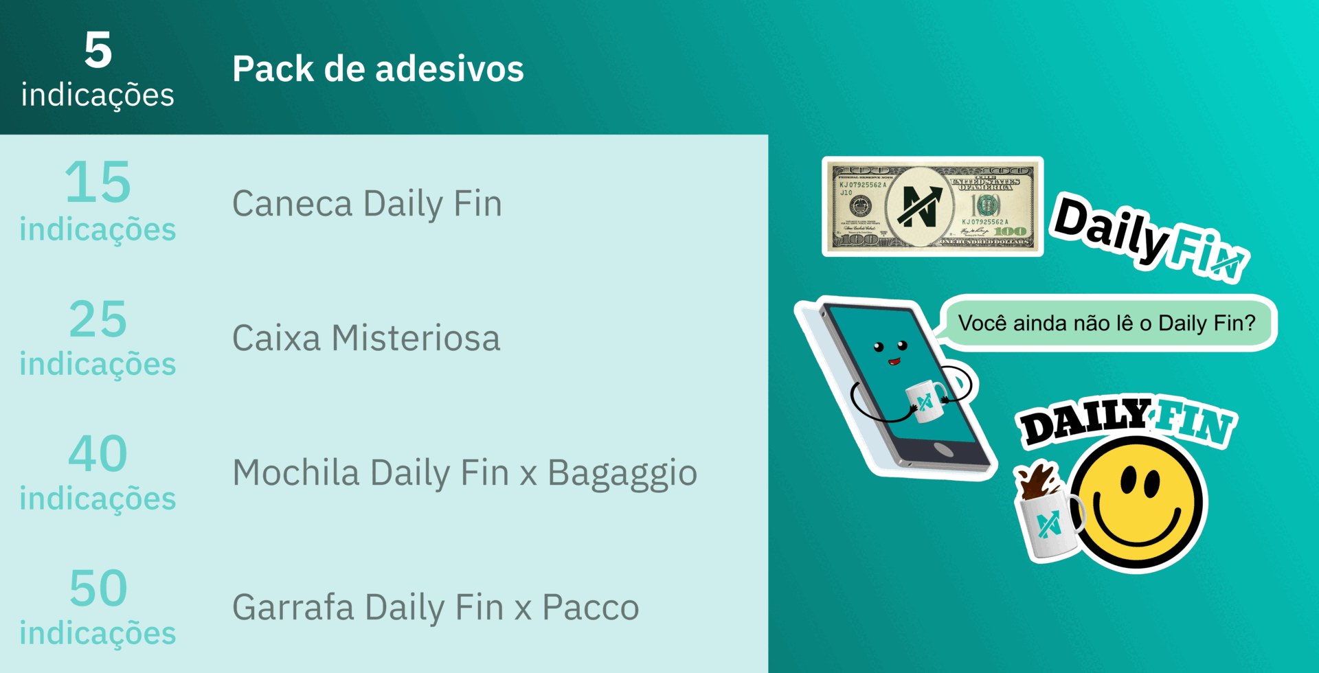 | 💭 Já imaginou começar seus dias lendo o Daily Fin e tomando um café na sua nova caneca preferida? Ou treinar com uma garrafa térmica que mantém a água geladinha? Só depende de você. | Clique no botão abaixo e compartilhe seu link exclusivo com seus amigos. Toda vez que alguém se inscrever com seu link, você ganha 1 indicação. | | Você tem atualmente 0 indicações, e faltam apenas 5 para receber o Pack de adesivos. | *Ou copie e cole seu link exclusivo: https://newsletter.radarfin.com.br/subscribe?ref=JvD1ZG6ZE7 *E-mails de mesmo IP serão considerados inválidos. |