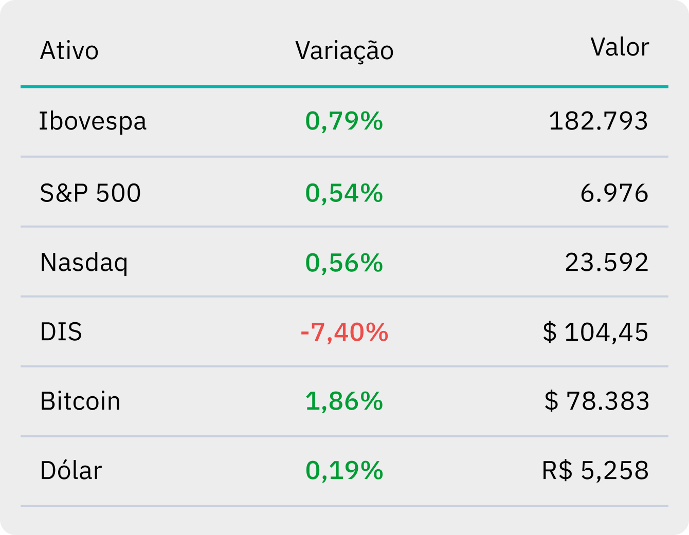 | | Data de referência em relação ao dia de ontem, 02/02. Horário de referência para o Bitcoin: 18h. | O Ibovespa fechou em alta de 0,79%, aos 182.793 pontos, nesta segunda-feira (02). Em Wall Street, o S&P 500 subiu 0,54%, enquanto o Nasdaq avançou 0,56%. | Por aqui, a possibilidade de Fernando Haddad indicar o secretário de Política Econômica, Guilherme Mello, para a diretoria do Banco Central gerou volatilidade nos mercados.