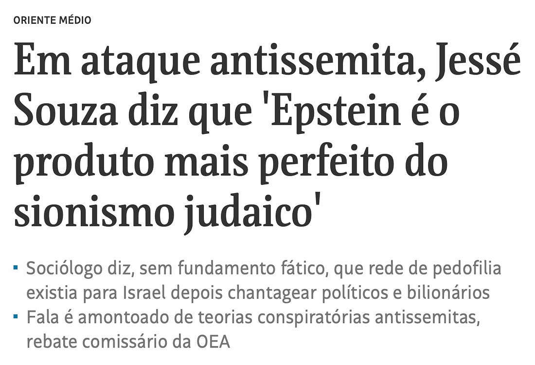 Na lógica de Jessé de Souza, se Jeffrey Epstein é judeu, logo os judeus são culpados pelos crimes de Epstein. É a sociologia baseada nos Protocolos dos Sábios de Sião. Mas uma idiotice nunca é dita sozinha. Para Jessé de Souza,