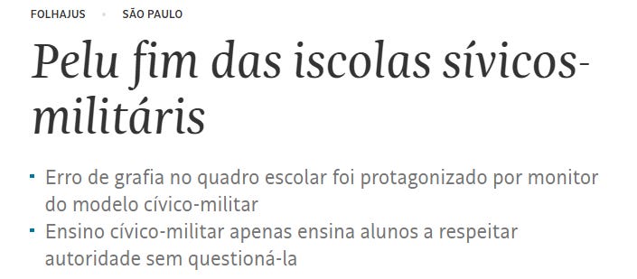 #PactoDaMediocridadeO erro na lousa da escola cívico-militar foi corrigido. Péssimo exemplo para um país que cultua um amontoado de palavras erradas sem que ninguém tenha a coragem de apagar e muito menos corrigirEm Caçapava (SP), um militar cometeu alguns erros de grafia numa escola cívico-militar. Escreveu ‘descançar’ e ‘continêcia’. Todos aqueles que são contra esse modelo de escola se levantaram e, subitamente, passaram a valorizar a gramática como a coisa mais importante que existe. Em um país seriamente comprometido com o projeto de se tornar o maior lupanar cognitivo do hemisfério sul, eis que surge um militar em Caçapava com a ousadia de cometer um “descanço” ortográfico. No deserto pedagógico bananeiro – onde a escola comum ensina o aluno a questionar tudo, desde o plural até a gravidade, onde a única continência é na moderação do volume de leitura – respeitar uma autoridade seria assumir que exista alguma. Um absurdo sem sentido... Assine Não É Imprensa para desbloquear o restante.Torne-se um assinante pagante de Não É Imprensa para ter acesso a esta publicação e outros conteúdos exclusivos para assinantes. Uma assinatura oferece a você: