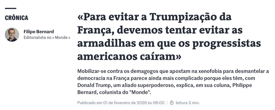 Se nos EUA a trumpização parece um caso perdido, na Europa, o tema aparece diluído em discussões mais amplas sobre populismo, descolamento das elites políticas e desgaste do discurso progressista tradicional. Mas um colunista do Le Monde, Filipe Bernard decidiu tocar na ferida. A ideia central do seu texto é a de que os progressistas americanos cavaram a própria cova ao ignorar angústias sociais concretas e ao moralizar excessivamente o debate público com suas pautas identitárias. A repercussão foi grande no final de semana. Mas como vivemos nessa época imemorável, tudo já caiu no esquecimento. Nos Estados Unidos e no Canadá, o trumpismo é tratado como um problema doméstico, explicado por variáveis internas, e raramente como um fenômeno mundial. Ninguém ignora os argumentos do colunista do Le Monde. No fundo, até concordam. O problema é que ninguém sabe ao certo o que fazer. Enquanto isso, Trump deita e rola. Atualmente, você é um assinante gratuito de Não É Imprensa. Para uma experiência completa, atualize a sua assinatura. |