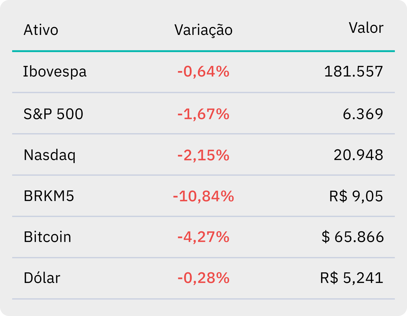 | | Data de referência em relação ao dia de ontem, 27/03. Horário de referência para o Bitcoin: 18h. | O Ibovespa fechou em queda de -0,64%, aos 181.557 pontos, nesta sexta-feira (27). Em Wall Street, o S&P 500 caiu -1,67%, enquanto o Nasdaq recuou -2,15%. | As incertezas sobre a duração dos conflitos no Oriente Médio elevaram novamente a aversão ao risco nos mercados. Ontem, o VIX, conhecido como o "Índice do Medo" de Wall Street, chegou a subir 13%. 📈