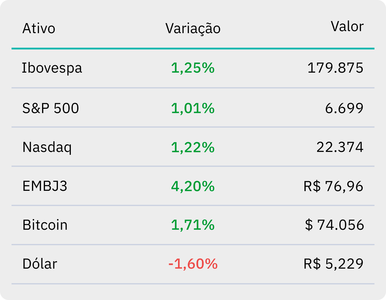 | | Data de referência em relação ao dia de ontem, 16/03. Horário de referência para o Bitcoin: 18h. | O Ibovespa fechou em alta de 1,25%, aos 179.875 pontos, nesta segunda-feira (16). Em Wall Street, o S&P 500 subiu 1,01%, enquanto o Nasdaq avançou 1,22%. | Mesmo sem sinais de um desfecho para a guerra no Irã, os mercados operaram com menor aversão ao risco. O petróleo Brent, por exemplo, fechou em queda de -2,84%, a US$ 100,21 o barril.