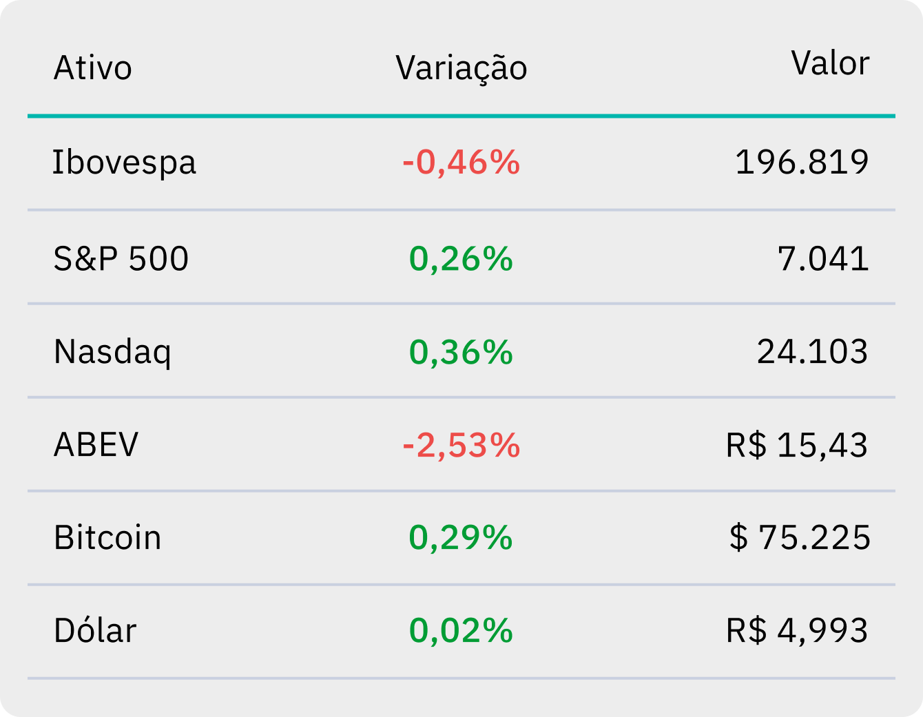 O Ibovespa fechou em queda de -0,46%, aos 196.819 pontos, nesta quinta-feira (16). Em Wall Street, o S&P 500 subiu 0,26%, enquanto o Nasdaq avançou 0,36% – ambos renovando suas máximas históricas. |