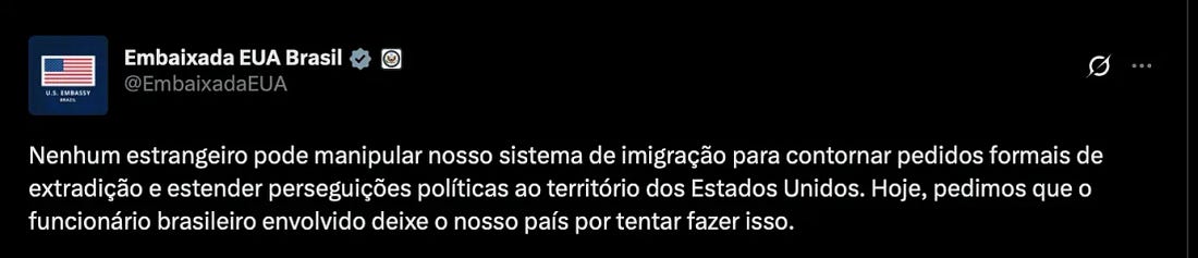 Mas se o delegado Ivo não foi expulso dos EUA, nem afastado das funções de “Oficial de Ligação da Polícia Federal junto ICE” por tentar “manipular o sistema de imigração”, que raio de reciprocidade de fim de semana foi essa, aplicada aos tais agentes americanos que jamais participaram de arapongagem para prender alguém no Brasil? Também tratamos disso aqui…👇🏾 Na verdade, essa reciprocidade temporária siginifica que, para os petistas, a soberania brasileira vale menos do que um final de semana prolongado. Atualmente, você é um assinante gratuito de Não É Imprensa. Para uma experiência completa, atualize a sua assinatura.