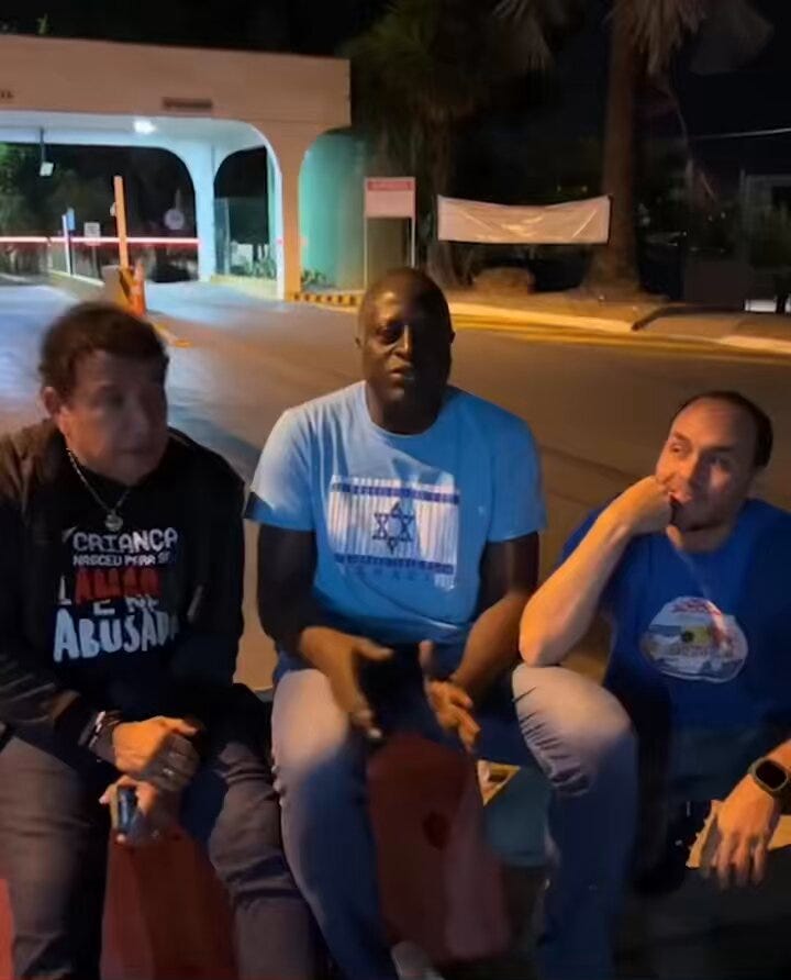 Enquanto isso, numa vigília esvaziada, em frente a prisão-domiciliar de Bolsonaro, Carluxo, Magno Malta e Helio Negão dizem que “a máscara vai cair”.