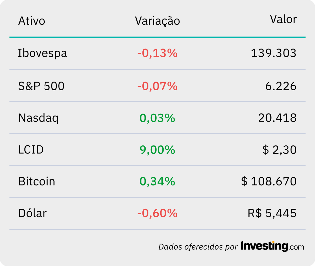 | | Data de referência em relação ao dia de ontem, 08/07. Horário de referência para o Bitcoin: 18h. | O Ibovespa fechou em queda de -0,13%, aos 139.303 pontos, nesta terça-feira (08). Em Wall Street, o S&P 500 recuou -0,07%, enquanto o Nasdaq avançou 0,03%. | | Ele também anunciou uma tarifa de 50% sobre as importações de cobre e ameaçou aplicar até 200% sobre produtos farmacêuticos. Como consequência, os contratos futuros de cobre subiram mais de 10% — a maior alta intradiária desde 1988. | Na bolsa, o destaque foi a empresa Lucid (LCID), que subiu 9% após bater o Recorde Mundial do Guinness de maior distância percorrida por um carro elétrico com uma única carga, chegando a 1.200 km. 🔋 | Por aqui, as vendas do varejo caíram -0,2% em maio, segundo o IBGE — a segunda queda seguida e abaixo da expectativa de alta de 0,2%. O resultado reforça os efeitos dos juros altos sobre o consumo. |
