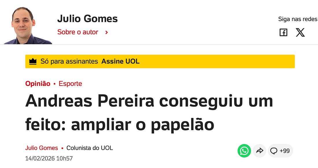 #OMalandroEOPuritanoComo um lance de futebol se tornou um pretexto para um jornalista lacrar sinalizando virtudesO jornalista Julio Gomes decidiu ensinar educação moral e cívica ao Brasil por causa de um pênalti perdido por Memphis Depay. A proposta: suspender Andreas Pereira do Campeonato Paulista para que o futebol e toda sociedade aprendam uma lição definitiva. Inflar a infração até que ela exorbite em carga simbólica capaz de sustentar uma cruzada civilizatória. Gomes é um mero sinalizador de virtudes. E isso eu posso demonstrar. Num dérbi, cada detalhe pesa no imaginário coletivo. Andreas Pereira foi pego raspando a grama da marca do pênalti para deslocar um centímetro de equilíbrio do jogador adversário. Ele assumiu o risco de punição. Conhecia o risco. No futebol, risco e cálculo respiram o mesmo ar. Memphis errou a cobrança. O fiel torcedor corintiano, conhecido por ser malandrão, caiu em silêncio. A vida não encontrou seu desfecho ali. O jogo continuou. A vida continuou. Convém lembrar de um detalhe besta: Andreas Pereira e Memphis Depay cresceram juntos. São amigos de infância. O duelo entre os dois cabia dentro de campo. Fora dele, amizade. A catimba pertence ao jogo; a relação pertence à vida. Confundir os dois registros já é delírio de moralistas. Para o puritano Julio Gomes, nada disso importa. Aquilo foi um “tapa na cara da sociedade”. Palavras solenes demais para um raspão de chuteira na grama, ainda que o objetivo fosse a trapaça. A expressão de Julio Gomes pertence ao vocabulário da dignidade civil, da violação de direitos, da ofensa que fere a convivência pública. A hipérbole aqui é o método de indignação desproporcional seletiva. Vamos filosofar um pouco. Johan Huizinga chamou ao ambiente de jogo de círculo mágico. Um território de exceção onde a vida comum suspende seus pesos habituais. As quatro linhas desenham uma ordem autônoma. Dentro dela, a experiência humana ganha outra densidade — regras próprias, tensões próprias, consequências internas. Honra e astúcia dividem o mesmo território. A norma ali vigente disciplina a infração; ela a prevê esse tipo de coisa. Estamos falando de cera e catimba. Estamos falando da falta tática, essa invenção sofisticada que interrompe o contra-ataque para proteger o time. A própria regra reconhece a existência da infração estratégica e responde com cartão. O sistema admite o cálculo, da astúcia. Se preferir, a pequena trapaça. Ele o disciplina. Porém, querer exterminar a malandragem do campo equivale a destruir todo sentido do jogo. Maradona ofereceu ao mundo a “Mão de Deus”. O belo gesto dividiu consciências e entrou na mitologia do esporte. O árbitro não viu. O futebol continuou. A vida continuou. A mesma bobaginha se repete no lance de Andreas: Raphael Claus não percebeu o jogador macular a grama. O VAR não pôde intervir porque o lance, na hipótese mais grave, renderia só o cartão amarelo — fora da alçada de revisão por vídeo. Ora, se a história do futebol convive com Maradona numa final de Copa do Mundo sem ruir, tratar Andreas no Paulistão como caso de tribunal é perder o senso de proporção. Racismo é crime contra a pessoa. Raspar a marca do pênalti com intenção de desequilibrar o adversário é tensão contra a geometria do jogo. Confundir as duas categorias é diluir ambas. Ofende quem sofre racismo e ofende o futebol. A escala importa. O antropólogo Roberto DaMatta ensinou, para o bem ou para o mal, sobre o “jeitinho brasileiro”. O futebol absorveu essa gramática e a transformou em forma estética. Ginga, brecha, improviso sob pressão. Malandragem. A astúcia funciona ali como instrumento de competição, dentro de um sistema que a reconhece e a sanciona. Ora, o drible também nasce dessa lógica. Todo drible carrega um componente de engano — o corpo promete uma direção e entrega outra. A malandragem de Andreas é uma infração tática com risco calculado. Não, ninguém se tornará santo ou demônio por isso. Julio Gomes pede punição “pedagógica”. A pedagogia que ele propõe desenha um mundo asséptico. O jogo de futebol é parêntese da rotina da vida. Se Claus tivesse visto o lance, teria aplicado o cartão amarelo. O tribunal corrige excessos quando necessário. A previsibilidade mantém a confiança no sistema. Substituir essa engrenagem pela indignação midiática é corroer a própria estrutura que se pretende defender. Andreas deu uma entrevista explicando o caso. Disse que estava “limpando a chuteira”. A fala integra o teatro. Jogadores performam diante do microfone. A declaração prolonga o duelo simbólico de um dérbi. A cultura midiática contemporânea exige algo diverso: a confissão. O arrependimento público, a autoincriminação lacrimosa que funciona como moeda de redenção no tribunal das redes sociais. Andreas recusou o ritual. O futebol brasileiro carrega tradição de malícia que atravessa dribles de corpo, olhares que enganam, catimba. Essa dimensão convive com o fair play sob tensão constante. A tensão é constitutiva. Uma concepção de pureza absoluta produziria esporte de planilha, previsível e morno. A linha entre esperteza e infração permanece móvel, vigiada pelo árbitro com cartões e apito. Essa linha existe para ser testada. O pênalti perdido de Memphis depois de um escorregão não ameaça a civilização. Ele apenas nos lembra que o jogo permanece humano. Quem pede um futebol higienizado — sem malícia, sem risco, sem astúcia — no fundo, odeia o futebol. E ousaria dizer que odeia o próprio país. Atualmente, você é um assinante gratuito de Não É Imprensa. Para uma experiência completa, atualize a sua assinatura. |