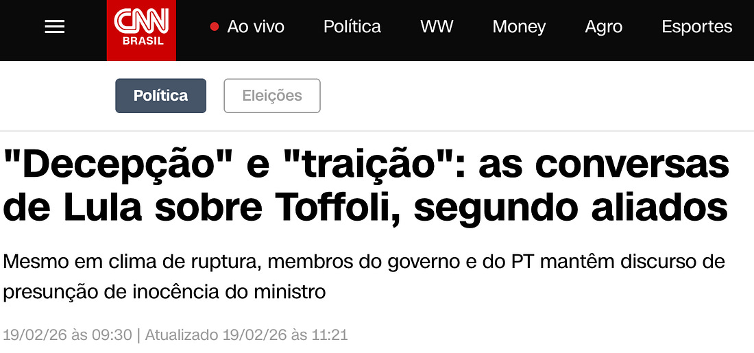 | Enquanto isso… Também veio à tona que o relatório da PF enviado ao STF cita mais de dez encontros entre Vorcaro e Toffoli. | Indo para a economia… 💼 | A taxa de desemprego do Brasil fechou 2025 com a menor média anual da série histórica em 19 estados e no DF – aprofunde. Especificamente no quarto trimestre, a desocupação do país ficou em 5,1%. | Entre os jovens de 18 a 24 anos, o desemprego recuou de 12,8% para 11,4%, também um mínimo recorde. |